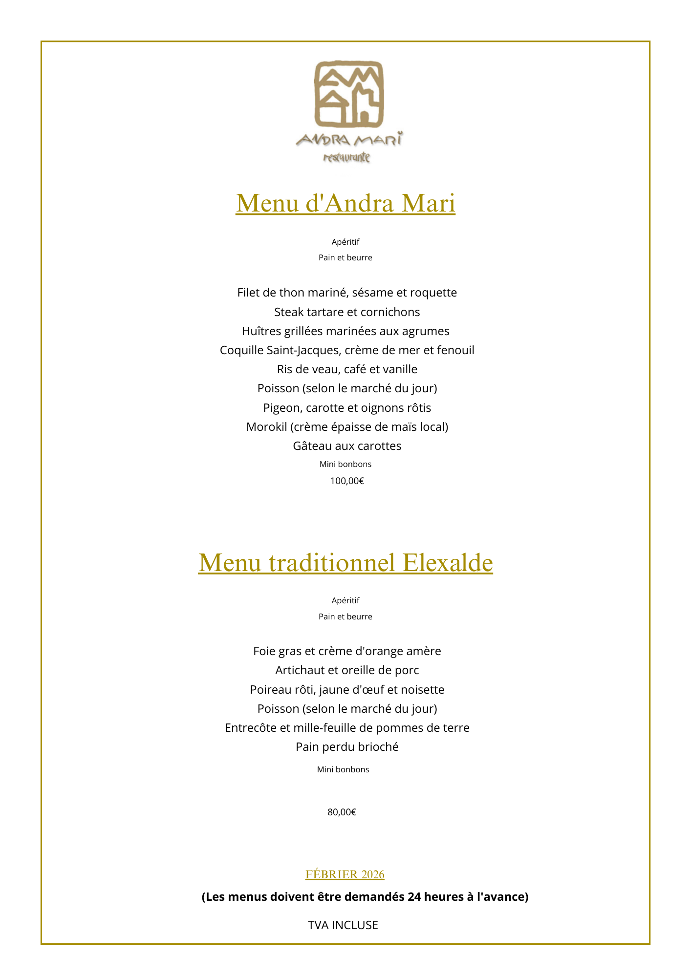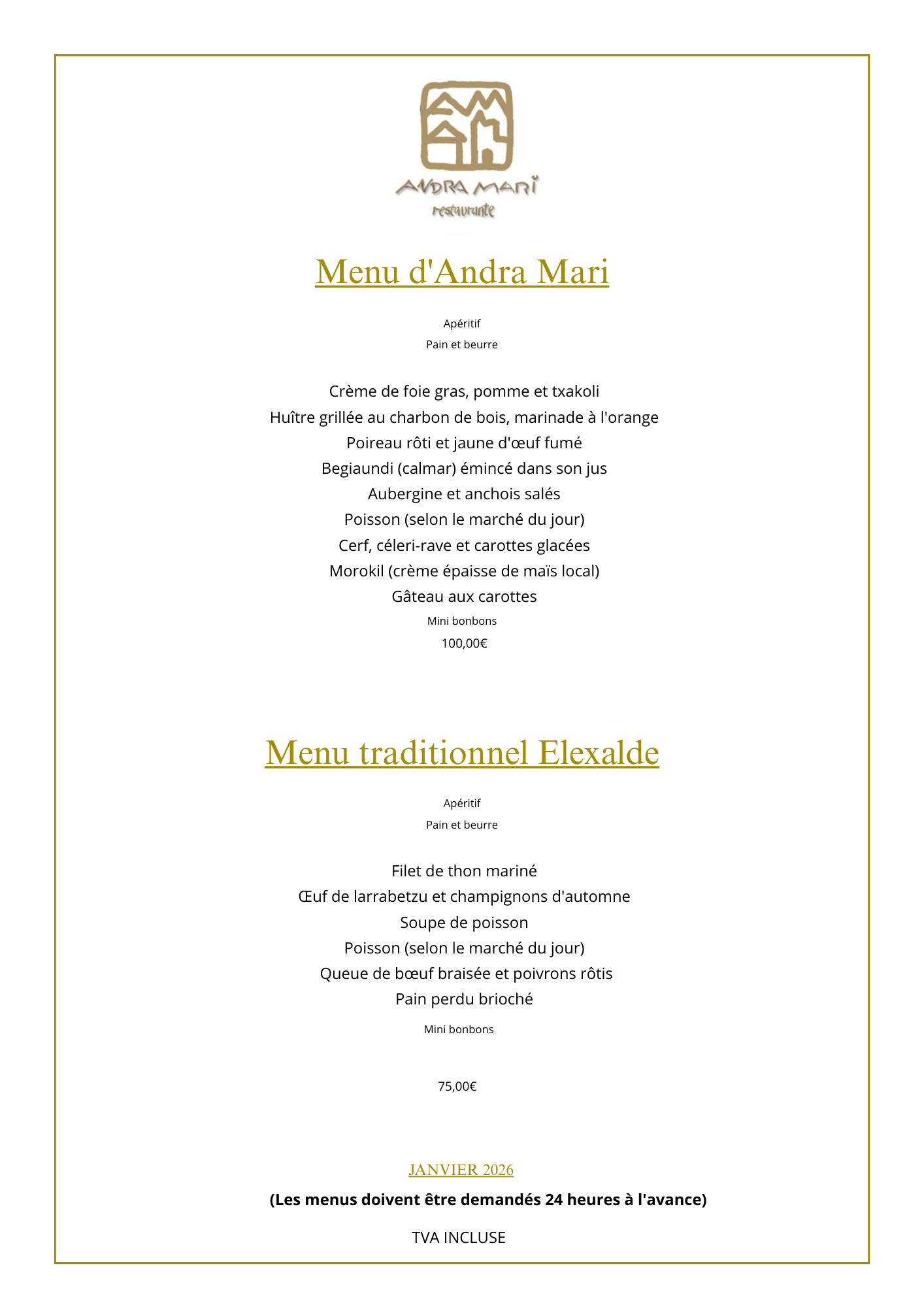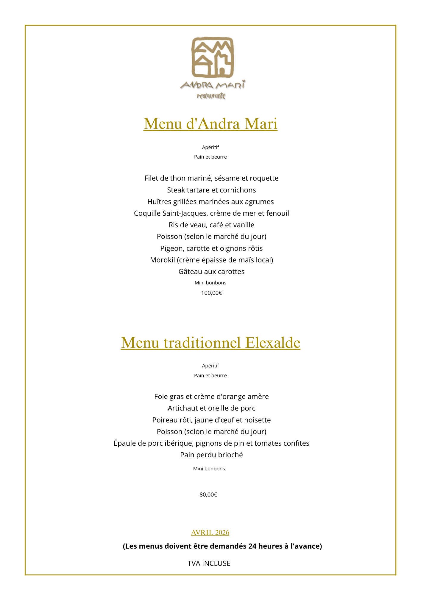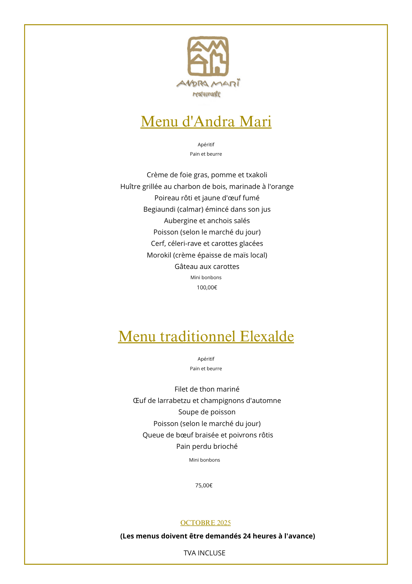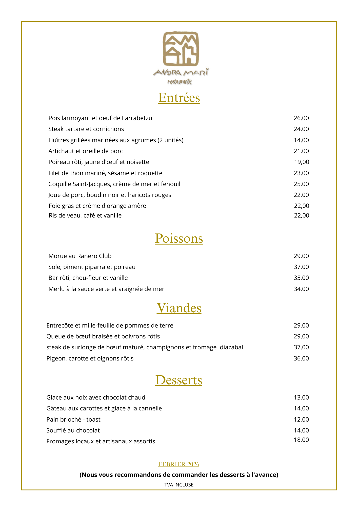 . ACCUEILLIR Le paradis de la paix gastronomique. . MENU Nous combinons tradition et innovation, en présentant et en cuisinant notre délicieuse et intemporelle cuisine basque comme jamais auparavant. CARTE MENU